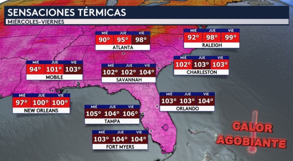 •Como resultado, las sensaciones térmicas para ciudades en el sureste del país irán aumentando empezando el miércoles y llegando a niveles peligrosos para finales de semana. A partir del viernes Tampa y Orlando se sentirán como los 106°F y 104°F, respectivamente. Mobile en Alabama donde hoy tendrán una sensación térmica en los 94°F y a partir del viernes una en los 102°F. También se sentirá como los tres dígitos en New Orleans a partir del jueves y también para el viernes. Tanto Atlanta como Raleigh estarán acercándose a los tres dígitos el viernes.