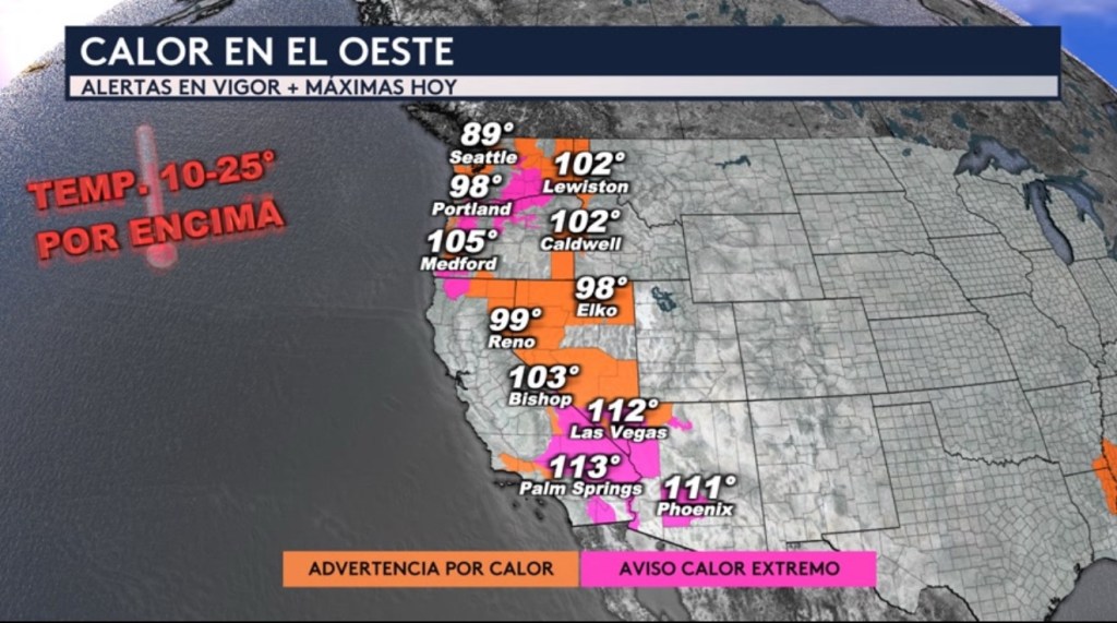 •No solo estaremos vigilando el calor excesivo a través del este del país sino también a través del oeste. Las advertencias por calor y avisos por calor extremo seguirán en vigor para esta jornada del martes desde el Pacífico Noroeste hasta los desiertos del suroeste. Incluirá ciudades como Seattle, Portland, Reno, Elko, Las Vegas, Palm Springs y Phoenix. Las temperaturas máximas para todas estas ciudades que están bajo alertas por calor serán de entre 10 a 25°F por encima del promedio para esta época del año esta tarde.