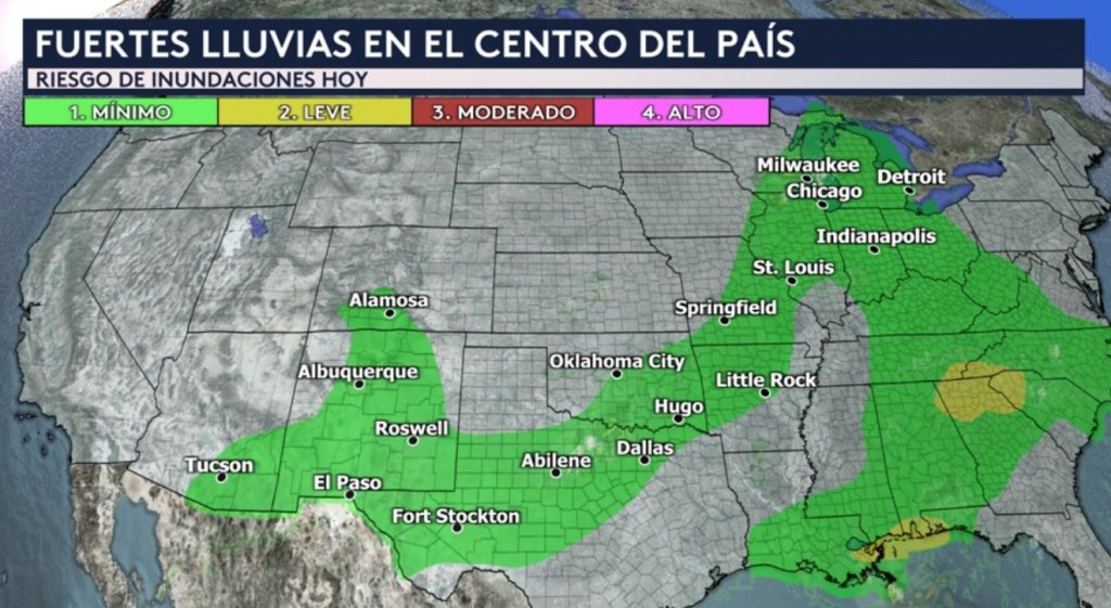 •Hoy habrá un riesgo mínimo (nivel 1 de 4) de inundaciones repentinas para una amplia zona desde la región de las Cuatro Esquinas (Colorado, Utah, Arizona y Nuevo México) a través del sur de las planicies, los Ozarks y el Medio Oeste superior y hasta los Grandes Lagos. Incluye ciudades como Tucson en Arizona, Albuquerque en Nuevo México, El Paso y Dallas en Texas, Oklahoma City en Oklahoma, Little Rock en Arkansas, St. Louis en Missouri, Indianapolis en Indiana, Chicago en Illinois, Milwaukee en Wisconsin y Detroit en Michigan.
