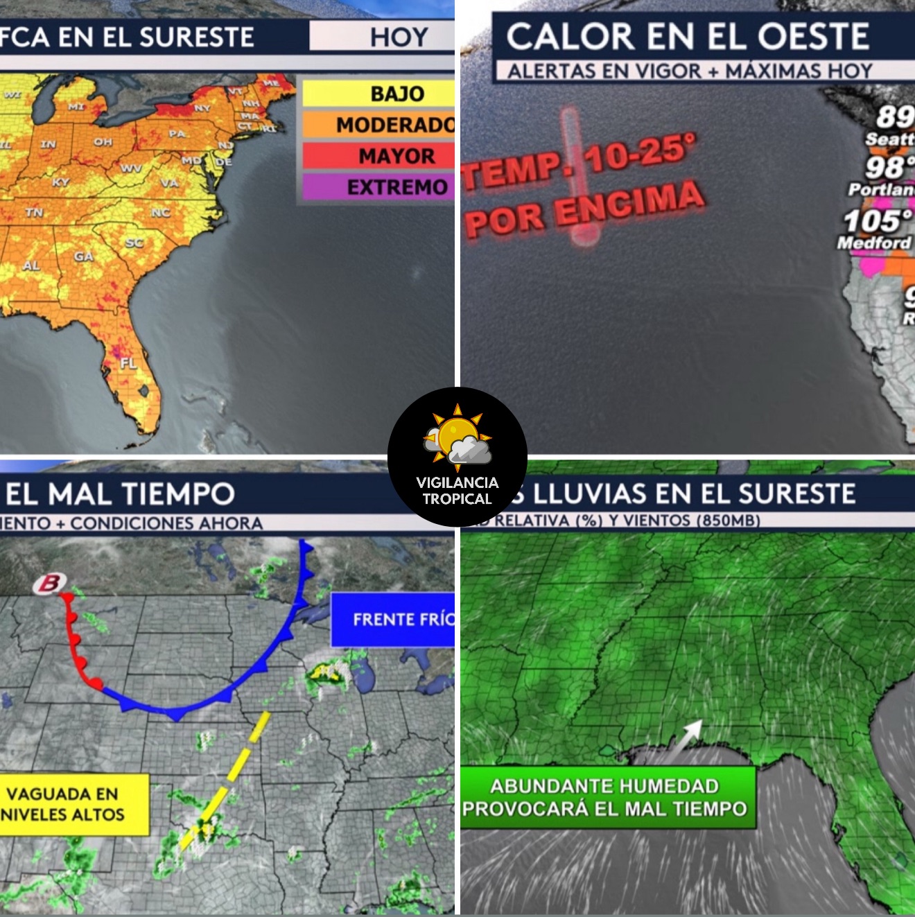 •Estaremos vigilando el mal tiempo a través del centro del país donde tendremos un frente frío de lento movimiento sobre el Medio Oeste y una vaguada, es decir un sistema de bajas presiones en los niveles altos de la atmósfera que provoca la inestabilidad, estrechada sobre las planicies del país.