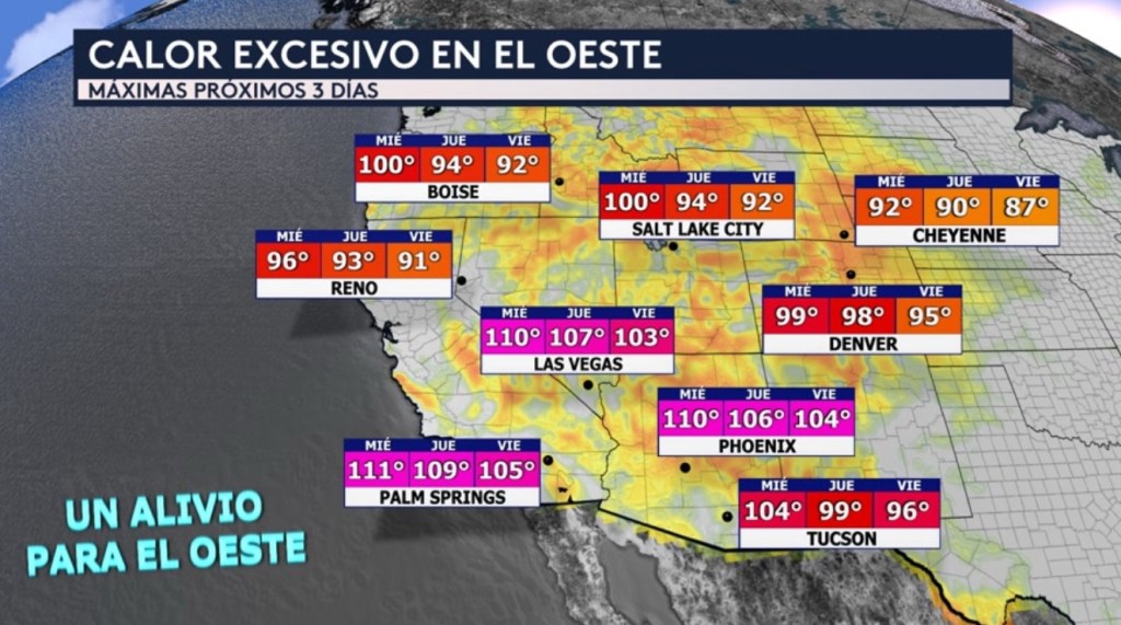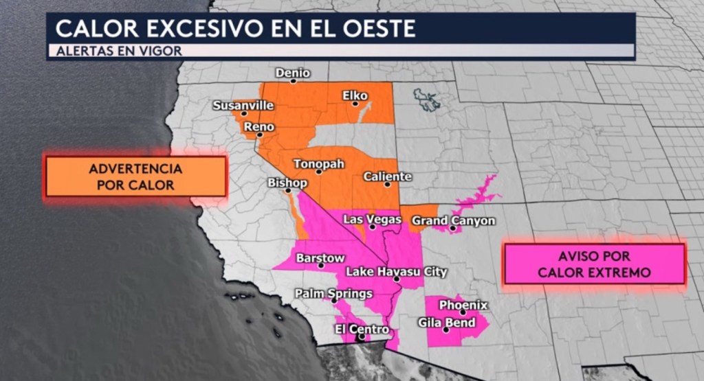 •Hay advertencias por calor y avisos por calor extremo todavía en vigor para el oeste del país hoy que incluye ciudades como Phoenix, Las Vegas, Palm Springs, Reno y Elko.