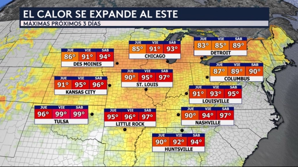 •Pero mientras que el calor se aleja del oeste, se estará intensificando para ubicaciones más al este para finales de semana y durante el fin de semana. La temperatura máxima llegará a los 93°F a partir del sábado en la ciudad de Chicago y a los 97°F en Nashville, St. Louis y Little Rock. Las máximas estarán acercándose a los tres dígitos en Tulsa el viernes y el sábado y a los 90°F en tanto Columbus en Ohio como Detroit en Michigan el sábado.