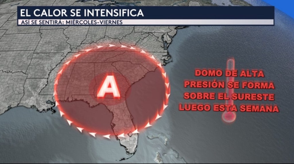 •Pero no solo aquí sino también en el sureste del país estaremos viendo el fortalecimiento del calor. Un domo de alta presión en los niveles altos de la atmósfera se estará formando y estacionando sobre este sector del país luego esta semana.