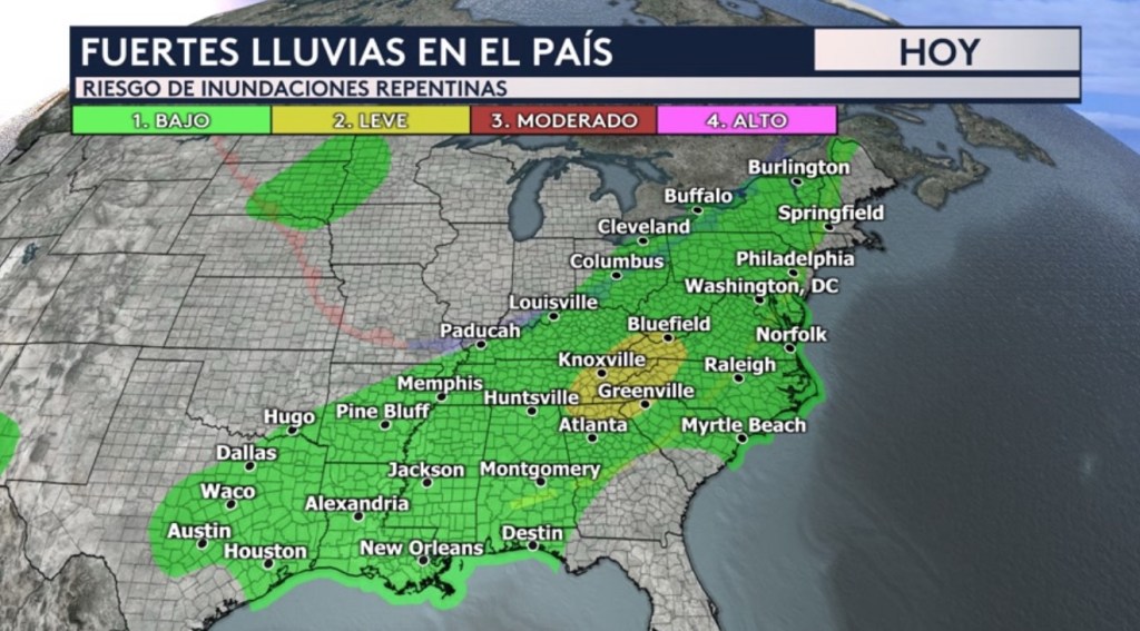Además de este riesgo bajo también habrá un riesgo más preocupante de inundaciones repentinas en la sombra amarilla de nivel 2 de 4 en la escala para el sur de las Montañas Apalaches que incluye las ciudades de Greenville en Carolina del Sur, Knoxville en Tennessee y Bluefield en Virginia Occidental.