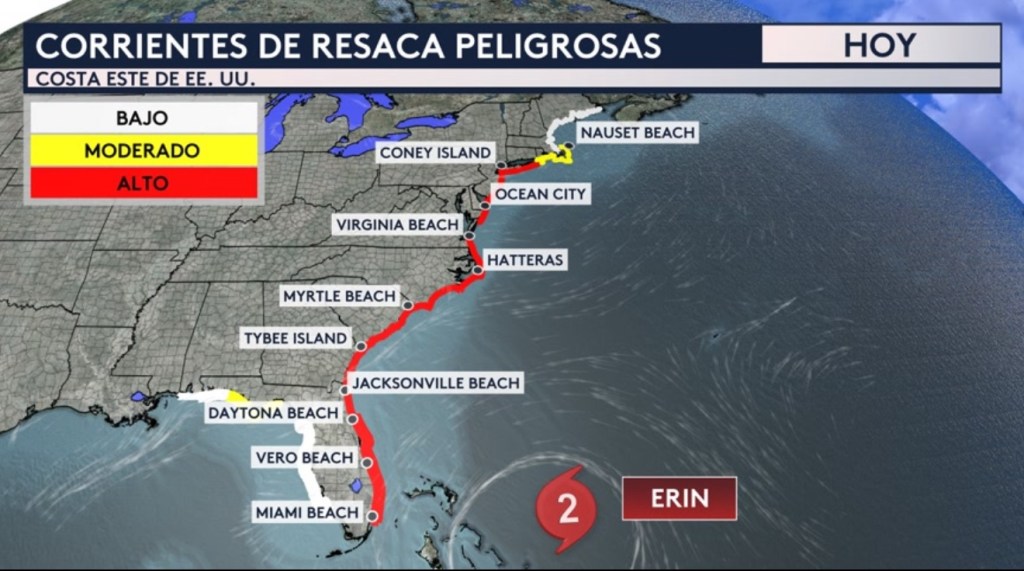 •A esta hora de mañana tenemos altos riesgos de corrientes de resaca a lo largo de casi la costa este del país entera desde Florida hasta Nueva York debido a las marejadas del Huracán Erin que ya han comenzado a afectar a las playas de la nación aunque su centro todavía está ubicado al este de las Bahamas.