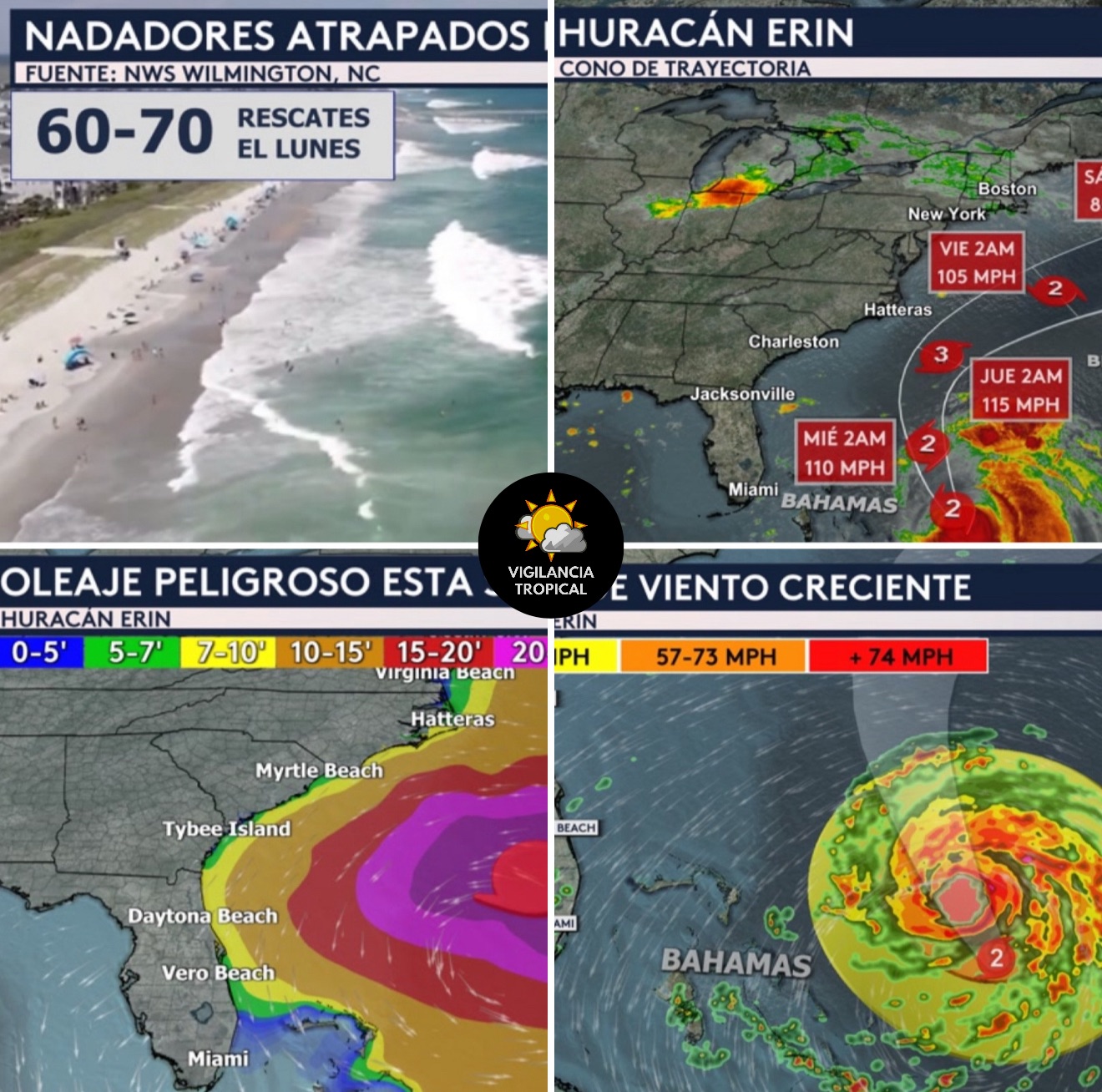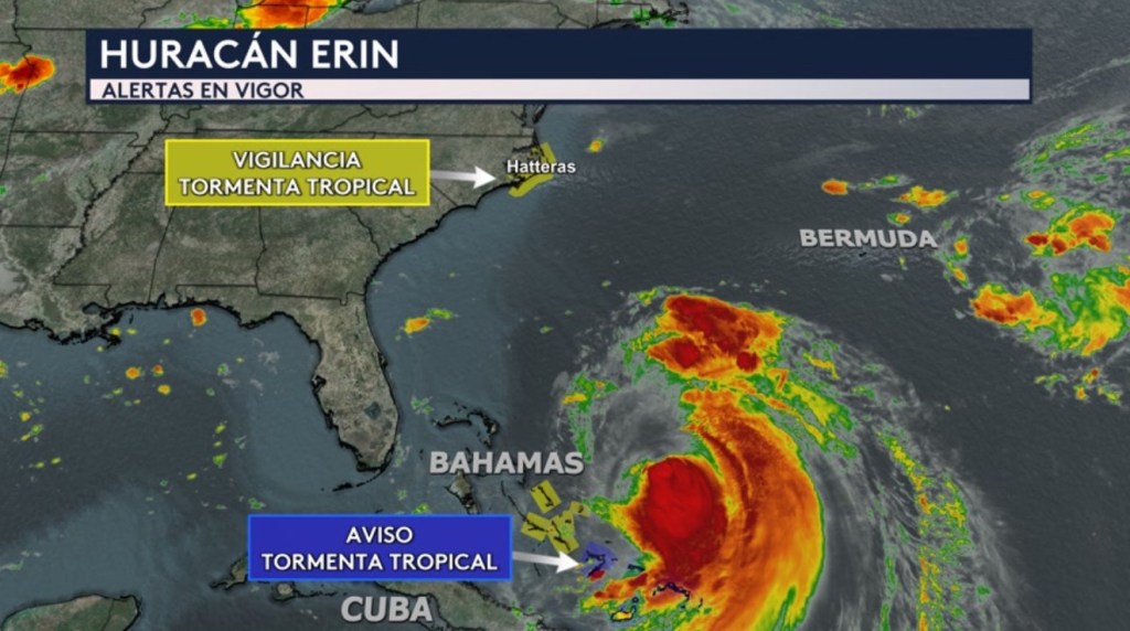 •Aunque Erin no estará tocando tierra en Estados Unidos, sus gran marejadas estarán produciendo oleaje peligroso para la costa este del país entera esta semana. Se espera el oleaje más grande a partir de mañana y para el jueves desde el sureste del país hasta las Carolinas. Desde Florida hasta las Carolinas estamos pronosticando oleaje de entre 5 a 15 pies de altura, pero de hasta 20 pies de altura en la costa de Carolina del Norte. Estas grandes olas rompientes pudieran causar erosión locamente significativas en las playas e inundaciones costeras.