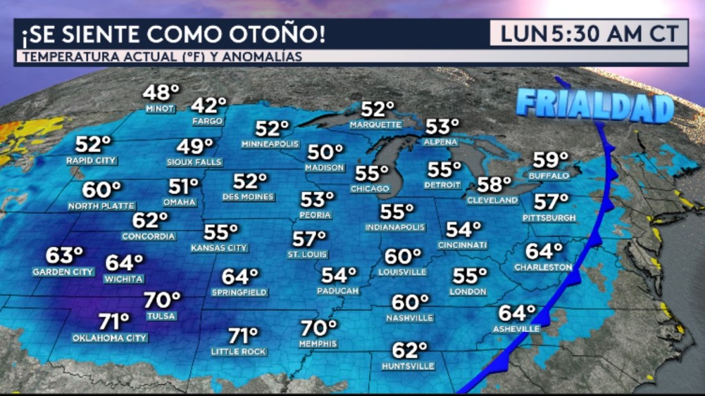 •¡El centro y partes del este del país principalmente al oeste de las Montañas Apaches están despertando hoy con temperaturas frías detrás de un fuerte frente frío! Estas temperaturas se sienten más como las de otoño y son de entre 5 a 20°F por debajo del promedio para esta época del año. Incluso, el norte del estado de Minnesota está a esta hora bajo una advertencia por escarcha. ¡Las Dakotas están reportando temperaturas en el rango de los 40°F! Pero no solo ahí, sino también en lugares tan al sur como las que se ubican en el Valle de Tennessee y partes del sureste están sintiendo esta masa de aire refrescante y fuera de temporada.