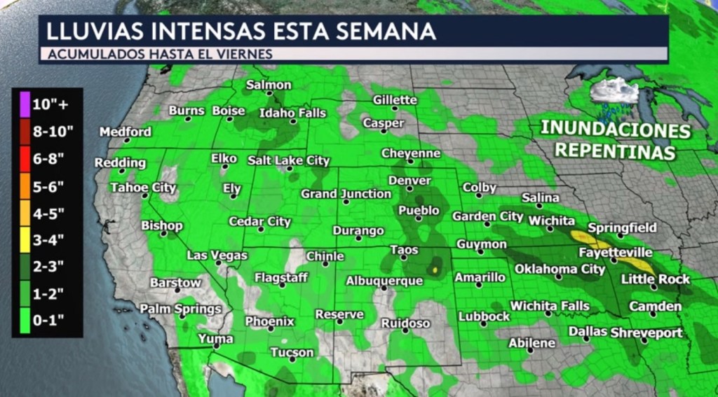 A lo largo de las altas planicies justamente al este de las Montañas Rocosas en los estados de Colorado y Nuevo México es donde los acumulados pudieran oscilar entre las 1 a 2 pulgadas con focos aislados más altos de hasta 2 a 4 pulgadas. A través de la región de las cuatro esquinas (Colorado, Utah, Nuevo México y Arizona) las lluvias monzónicas estarán produciendo acumulados generalizados de hasta una pulgada con focos aislados más altos de hasta las 2 pulgadas. Estaremos vigilando estos sectores del país muy de cerca durante los próximos días para las inundaciones repentinas, pero especialmente a los desiertos del suroeste debido a que no se requiere tanta lluvia para provocar las inundaciones repentinas aquí.