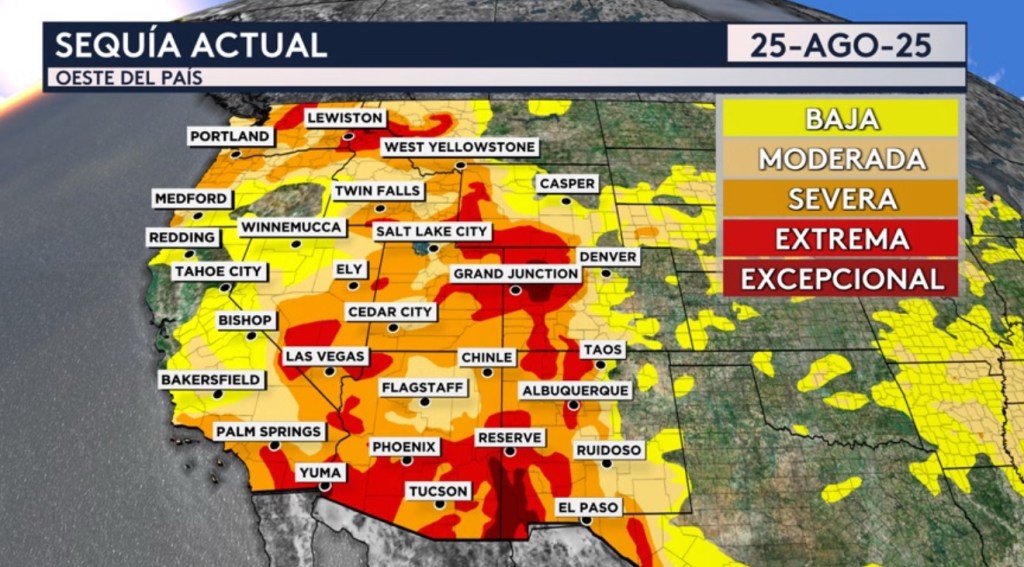 •Aunque esta cantidad de lluvia pudiera caer en muy poco tiempo y causar problemas a niveles locales, será generalmente beneficiosa para este sector del país ya que la gran mayoría del oeste del país está actualmente bajo sequía de entre severa a extrema. Incluso hay algunas localidades hacia el noroeste del estado de Colorado y alrededor de la frontera entre Nuevo México y Arizona donde tenemos la peor sequía en la escala de evaluación: sequía excepcional.