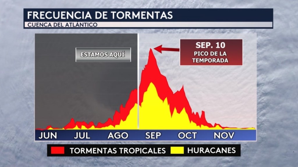 •Todavía tenemos el periodo más activo de la temporada de huracanes por venir. El pico de la temporada está ya dentro de las próximas 3 semanas: el 10 de septiembre. Según los datos climatológicos, este es el día de la temporada donde normalmente tenemos la mejor probabilidad de tener al menos una tormenta activa en la cuenca. Desde ahora hasta la conclusión de la temporada (30 de noviembre), todavía nos queda el 78 % de la actividad ciclónica de la temporada.