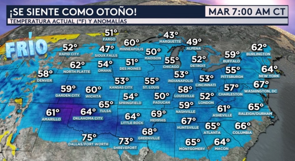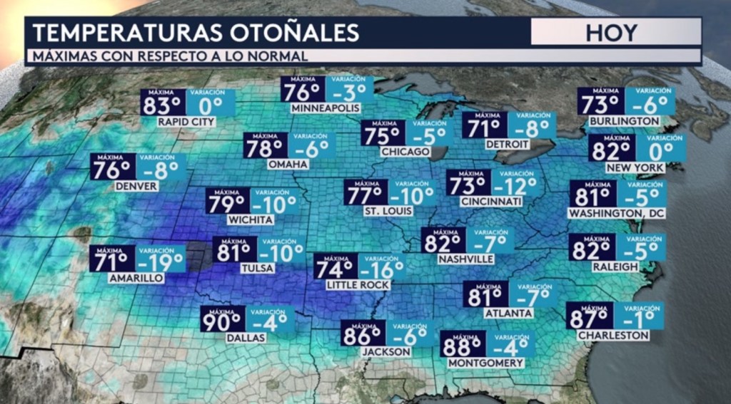 •Esa masa de aire refrescante se mantiene hacia la mitad este del país a esta hora de la mañana. Las temperaturas actuales mostradas son de entre 5 a 20°F por debajo del promedio para esta época del año. Las anomalías más bajas se ubican en los panhandles de Oklahoma y Texas, pero muchas grandes ciudades como Nueva York, Chicago, Washington DC, Detroit, St. Louis, Nashville, Oklahoma City, Atlanta y Raleigh también se ven gozando de estas temperaturas agradables.