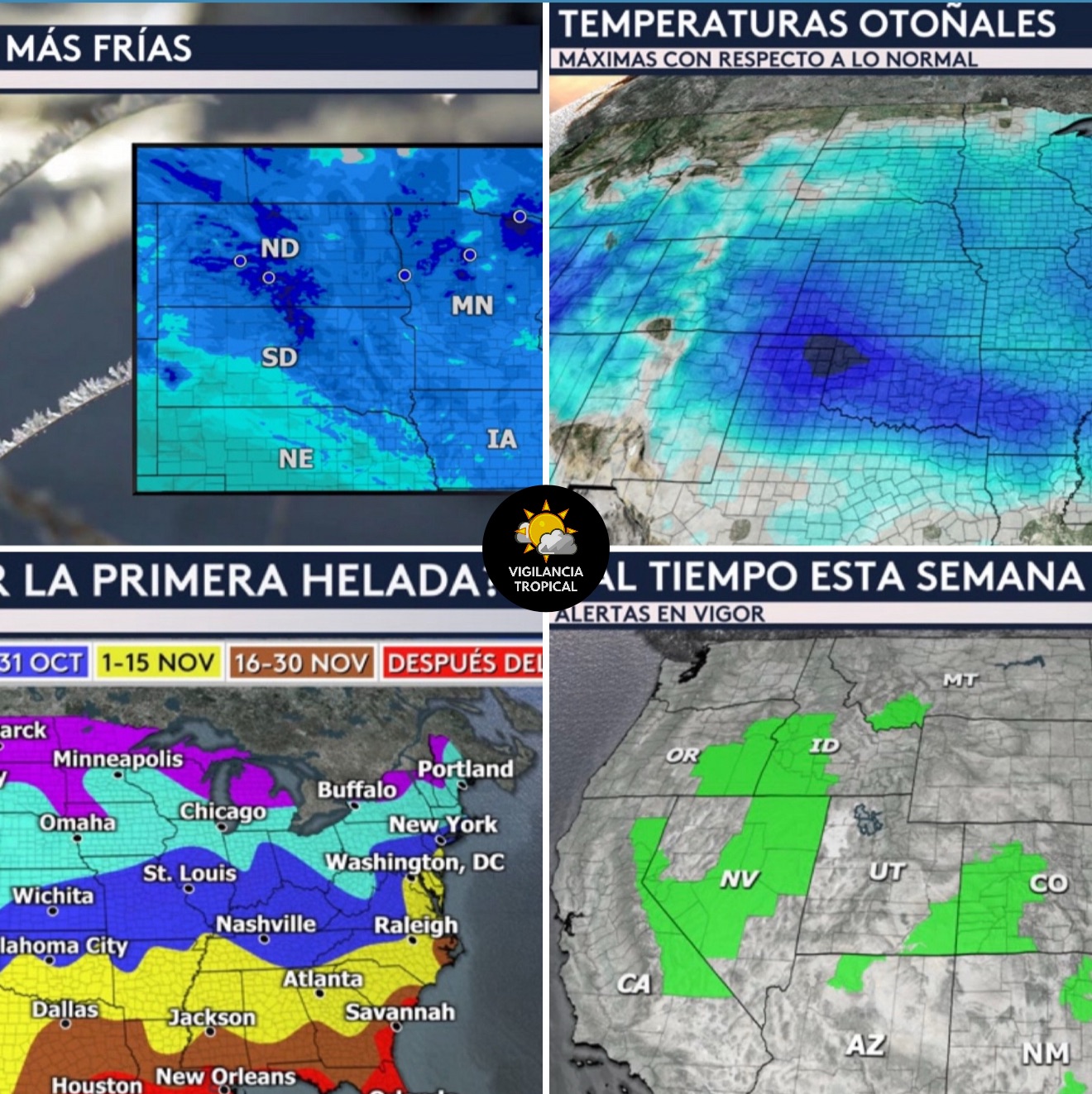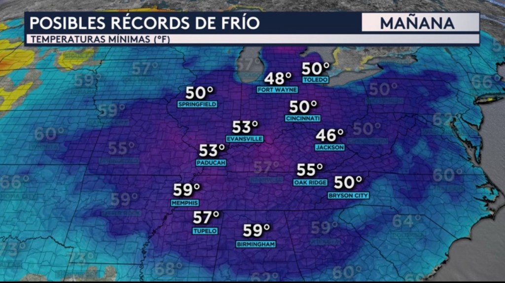 •Las temperaturas mínimas mañana miércoles se mantendrán frías. El enfoque de las anomalías de temperatura más bajas será sobre el Medio del Valle del Río Mississippi, el Valle del Río Ohio, el Valle de Tennessee y partes del sudeste donde pueden observar esos colores de azul y morado más oscuros. ¡Mañana también empezaremos a ver esta masa de aire otoñal desplazarse más al sur hacia ciudades que se ubican frente la costa del golfo y el norte de Florida!