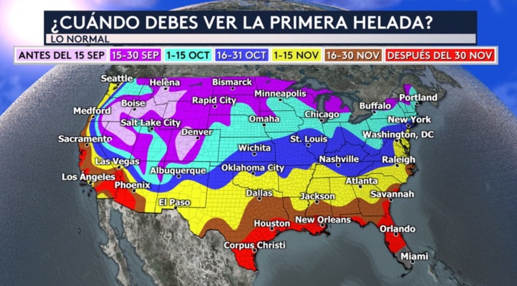 •Despues de que algunas ciudades habían coqueteado con temperaturas en el punto de congelación al amanecer ayer en partes de Dakota del Norte y Minnesota, vemos este mapa que nos muestra las fechas de cuando los distintos sectores del país normalmente experimentan su primera helada. La primera temperatura congelante de 32°F o menos no se debe registra en el norte del país, es decir en los estados de Dakota del Norte y Minnesota, ¡sino hasta mediados a finales del mes de septiembre! Según la climatología, los primeros que normalmente experimentan la primera helada del año se ubican en los alrededores de las Montañas Rocosas y en la Gran Cuenca donde debe ocurrir antes del 15 de septiembre. Más al sur hacia el centro del país, la primera helada normalmente no ocurre sino hasta el mes de octubre.