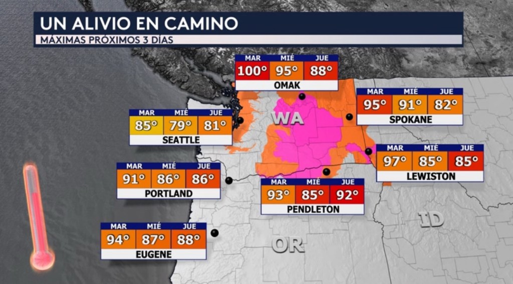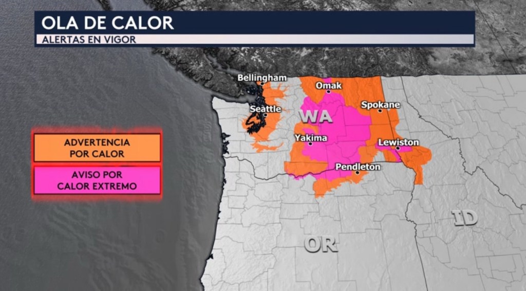 •Mientras que el este del país esté experimentando un anticipo de otoño el noroeste todavía estará sintiendo esas temperaturas de pleno verano. Aunque ya el calor ha disminuido para lugares más al sur como en gran parte de Oregón y los valles de California, la historia es distinta para partes de Washington, Oregón y Idaho donde las temperaturas altamente peligrosas han persistido. Seguimos hoy con advertencias por calor y avisos por calor extremo que incluye ciudades como Seattle. Estas alertas se mantendrán en vigor para un día más y expirarán el miércoles.