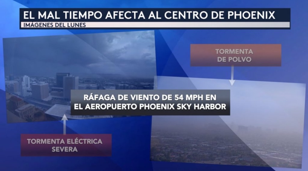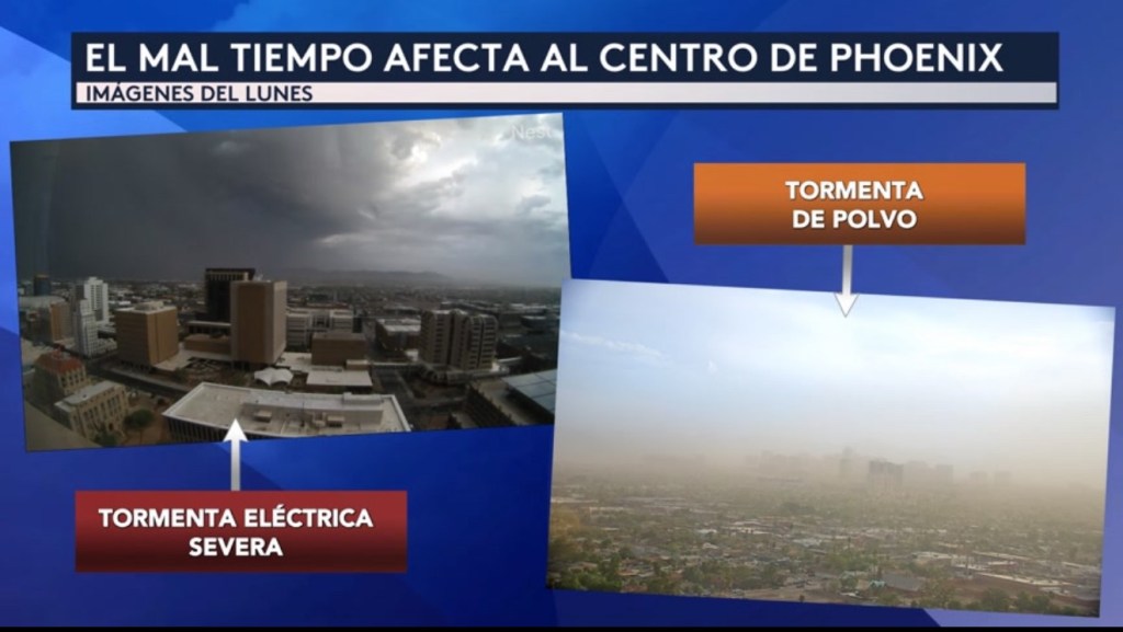•El mal tiempo afectó a Phoenix en Arizona ayer lunes 1 de septiembre, donde la ciudad durante horas de la tarde se encontró bajo tanto un aviso por tormenta eléctrica severa como por tormenta de polvo.