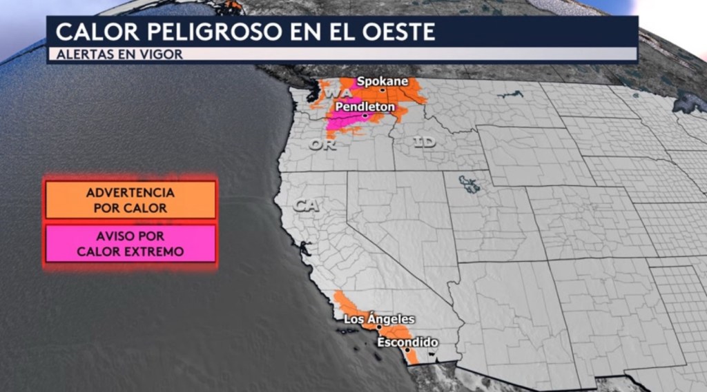 •Siguen en vigor las alertas hoy por calor en el oeste del país. Hay advertencias por calor para el sur de California que incluye las ciudades de Los Angeles y Escondido y también para el interior del Pacífico Noroeste que incluye partes de los estados de Washington, Oregón, Idaho y Montana y ciudades como Spokane en Washington. Hay un aviso de calor extremo en el color rosado para la Cuenca del Río Columbia que incluye partes del los estados de Washington, Idaho y Oregon y ciudades como Pendleton en Oregón; Omak, Pasco y Yakima en Washington y Lewiston en Idaho.