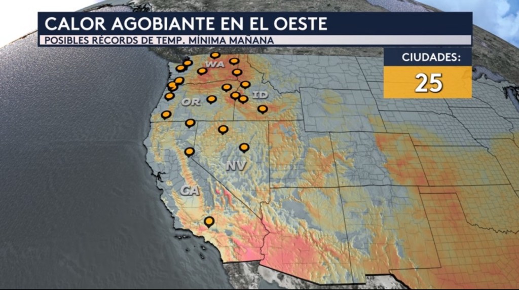•Pero no solo estaremos lidiando con estas temperaturas agobiantes durante horas de la tarde sino también por la noche. Al amanecer el miércoles 25 ciudades a través del oeste del país en los estados de California, Oregón, Idaho y Washington pudieran estar batiendo un récord de temperatura mínima cálida, es decir que para la fecha la temperatura mínima estará las más alta jamás registrada. Ni si quiera las temperaturas se estarán refrescando en la noche, lo que significa que se debe tomar las medidas adecuadas para protegerte del calor y tener varias formas de enfriarte.