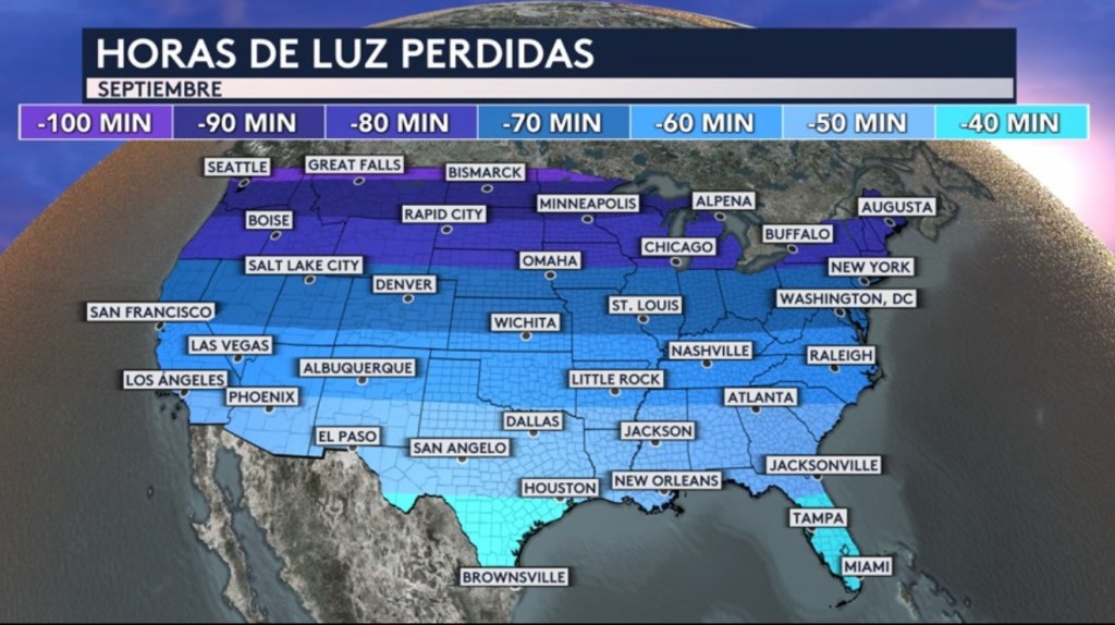 •Todo es debido a que nuestra nación lentamente estará observando un pérdida de luz ahora en el mes de septiembre y eventualmente hasta que lleguemos al solsticio de invierno (el 21 de diciembre). El norte del país es donde normalmente experimentamos las pérdidas de luz más significativas en el mes de septiembre, ¡de entre 80 a 100 minutos! Mientras más al sur, menos la pérdida de luz pero todavía existente. El centro del país pierde alrededor de o un poco más de una hora de luz mientras que el sur pierde entre 40 a 50 minutos de luz.