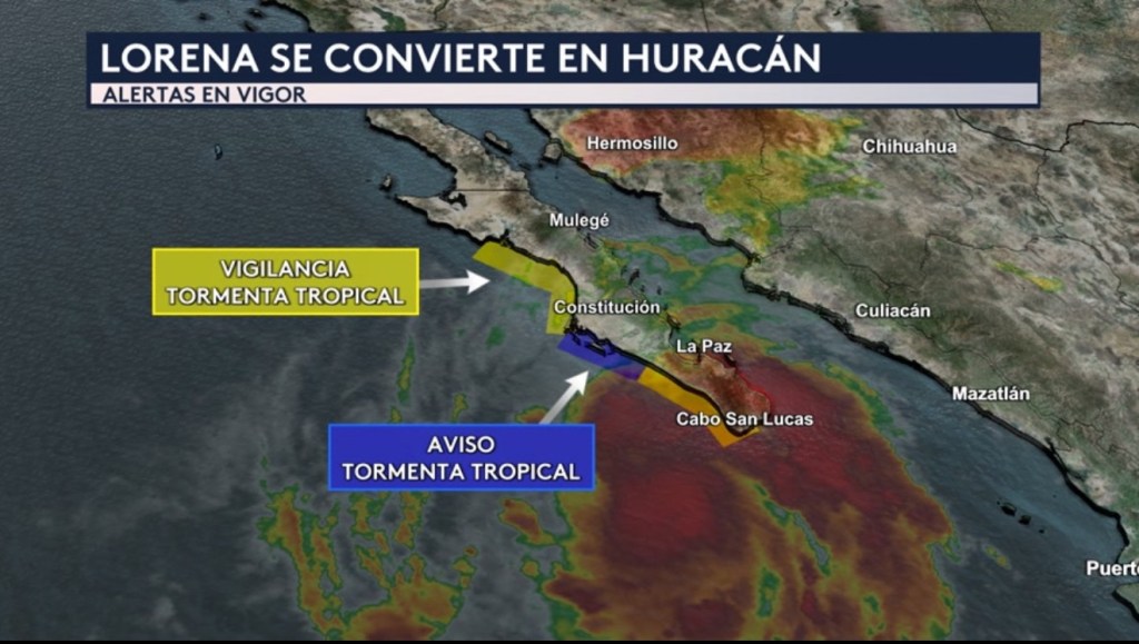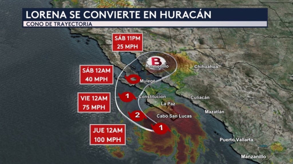 •Según la última actualización del Centro Nacional de Huracanes, Lorena es huracán de categoría 1 con vientos máximos sostenidos de 75 mph. Se encuentra a unas 105 millas al suroeste de Cabo San Lucas y su movimiento lo lleva actualmente al noroeste a unas 15 mph.
