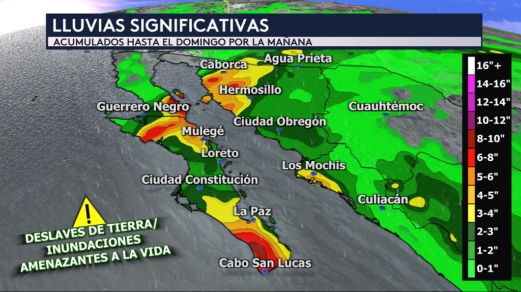 •El peligro principal de Lorena será las fuertes lluvias que pudieran causar inundaciones repentinas y deslaves de tierra amenazantes a la vida en Baja California Sur, Baja California y los estados de Sinaloa, Sonora y Durango en México continental. Nuestro modelo está mostrando la posibilidad de que se acumulen hasta 10 pulgadas tanto en el extremo sur de Baja California Sur como al norte de Baja California Sur y al sur de Baja California. El noroeste del estado de Sonora en México pudiera recibir hasta 8 pulgadas en zonas aisladas mientras que la costa de Sinaloa y Durango recibirán entre 4 a 5 pulgadas y entre 3 a 4 pulgadas aisladas, respectivamente. Estos acumulados son válidos hasta el domingo por la mañana.