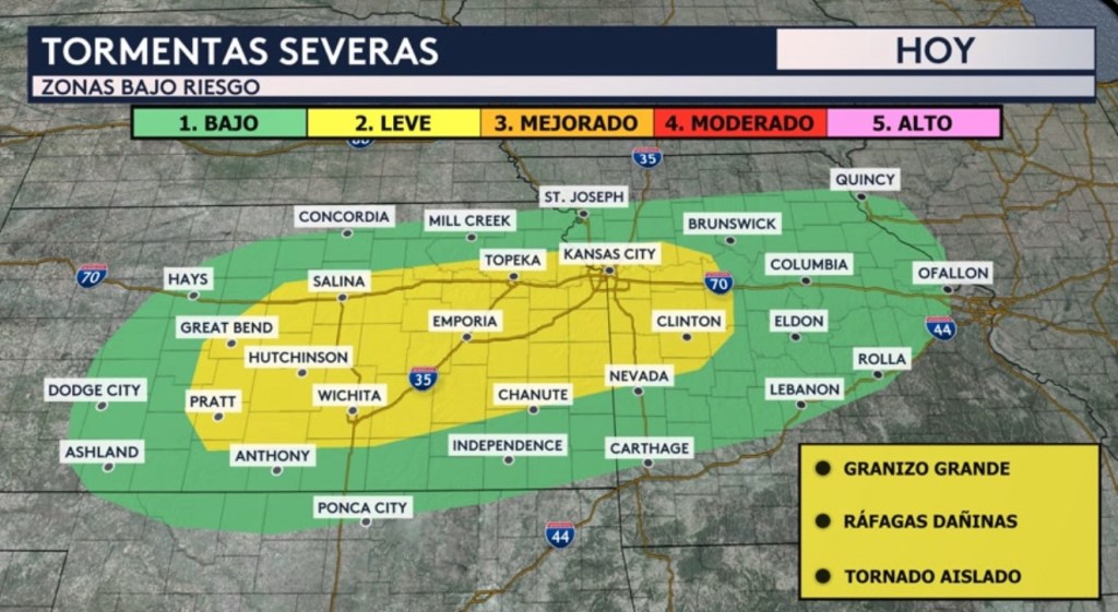 •Habrán riesgos de bajos (nivel 1 se 5) a leves (nivel 2 de 5) de tiempo severo para partes de los estados de Kansas, Missouri y Oklahoma. Bajo un riesgo bajo se encuentran ciudades como Dodge City, Hays, Concordia en Kansas; Ponca City en Oklahoma; St. Joseph, Columbia, Jefferson City, Rolla, Lebanon y OFallon en Missouri y Quincy en Illinois. Bajo un riesgo leve se encuentran las áreas metropolitanas de Kansas City en Missouri y Topeka en Kansas al igual que ciudades como Emporia, Wichita, Salina y Hutchinson.