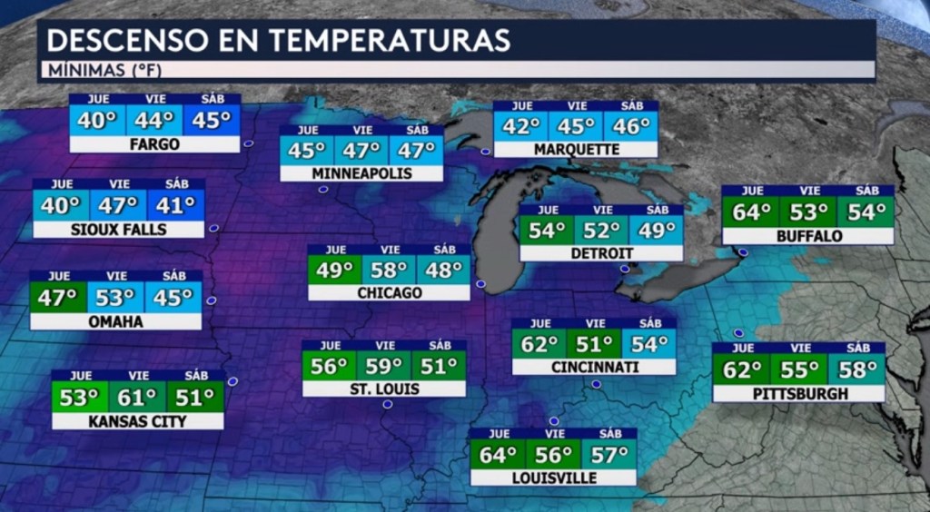 •Las temperaturas mínimas estarán bajando al rango de los 40°F en las Dakotas al igual que en Nebraska, Minnesota, Iowa, Wisconsin, Illinois y la peninsula superior de Michigan detrás del primer frente frío al amanecer mañana jueves. Noten ese ligero ascenso en las temperaturas mínimas el viernes pero a partir del sábado por la mañana detrás del segundo frente frío las temperaturas estarán bajando nuevamente. Este aire frío llegará tan al sur como hasta el Valle de Ohio y las planicies centrales y tan al este como hasta el este de los Grandes Lagos, afectando a ciudades como Kansas City, Louisville, Cincinnati, Pittsburgh y Buffalo.
