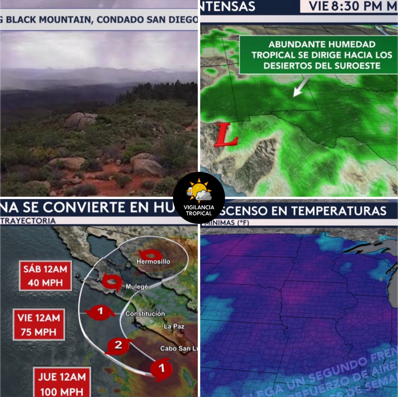 •Vemos un impresionante vídeo desde la cima de Big Black Mountain, que se encuentra a 4,000 pies de altura, en el condado San Diego en California. Se pueden observar las sombras de lluvia a medida que los aguaceros monzónicos pasaron por la región ayer temprano por la mañana.