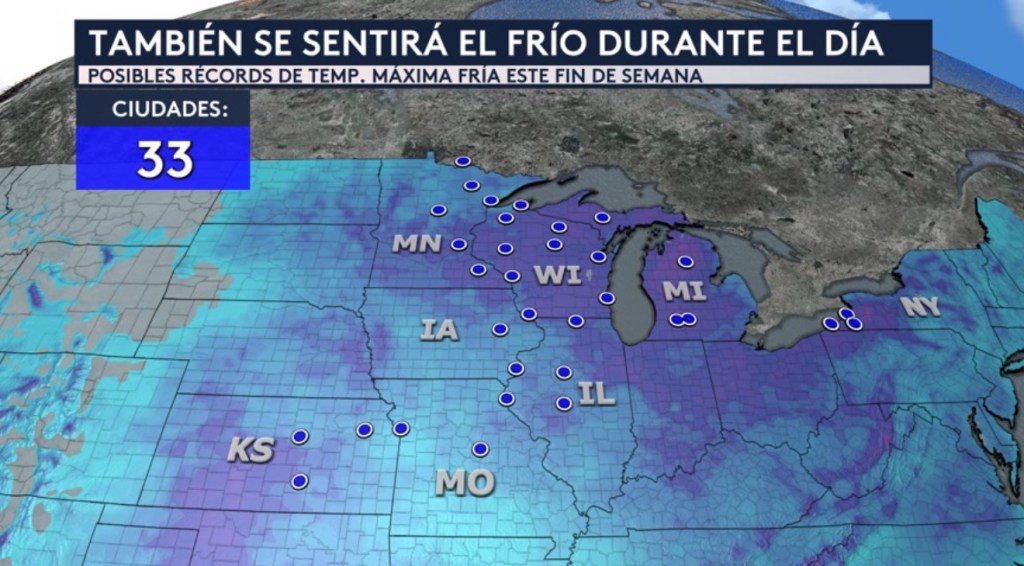 •No solo se estarán sintiendo esas temperaturas otoñales por la mañana, sino también durante horas de la tarde. Este fin de semana (desde hoy hasta el domingo) 33 ciudades tendrán la oportunidad de romper un récord de temperatura máxima fría, es decir que la temperatura máxima en cada una de estas ciudades pudiera ser la más fría que jamás se ha registrada en cada jornada.