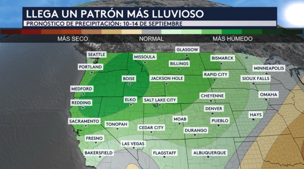 •Las buenas noticias es que se espera un patrón más lluvioso no solo para California sino también gran parte del oeste del país para la semana entrante. Hay una 50-70 % de probabilidad de que las precipitaciones sean por encima del promedio en los colores verde las oscuros, precisamente desde el 10 y 14 de septiembre.