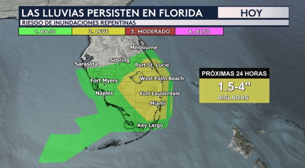 •Nos vamos para Florida donde el centro y sur de la península estarán lidiando nuevamente con el potencial de fuertes lluvias esta tarde debido a un frente estacionario que sigue estancado. Hay un riesgo bajo (nivel 1 de 4) en vigor para ciudades como Melbourne, Sarasota, Fort Myers, Naples y Key Largo. Pero hay un riesgo más alto de nivel 2 de 4 en vigor para ciudades como Miami, Fort Lauderdale, West Palm Beach y Port St. Lucie debido a los altos acumulados de lluvia que han recibido las áreas metropolitanas de estas ciudades desde principios de semana. Nuestra guía de conjunto de modelos indica que pudiéramos ver totales aislados de precipitación de entre 1.5 a 4 pulgadas durante las próximas 24 horas dentro de la sombra sombreada con el color amarillo.