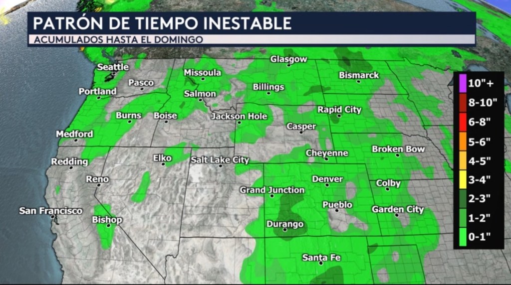•Este patrón inestable se mantendrá hasta el fin de semana para el oeste, donde la misma vaguada que estará atravesando este sector del país pudiera producir acumulados de lluvia de entre 1 a 3 pulgadas en el oeste del estado de Colorado al igual que al norte del estado de Dakota del Norte entre hoy jueves y el domingo por la noche. Por otras partes, pronosticamos acumulados en zonas localizadas de entre 1 a 2 pulgadas hacia las planicies altas (justamente al este de las Montañas Rocosas) y en el oeste intermontano.