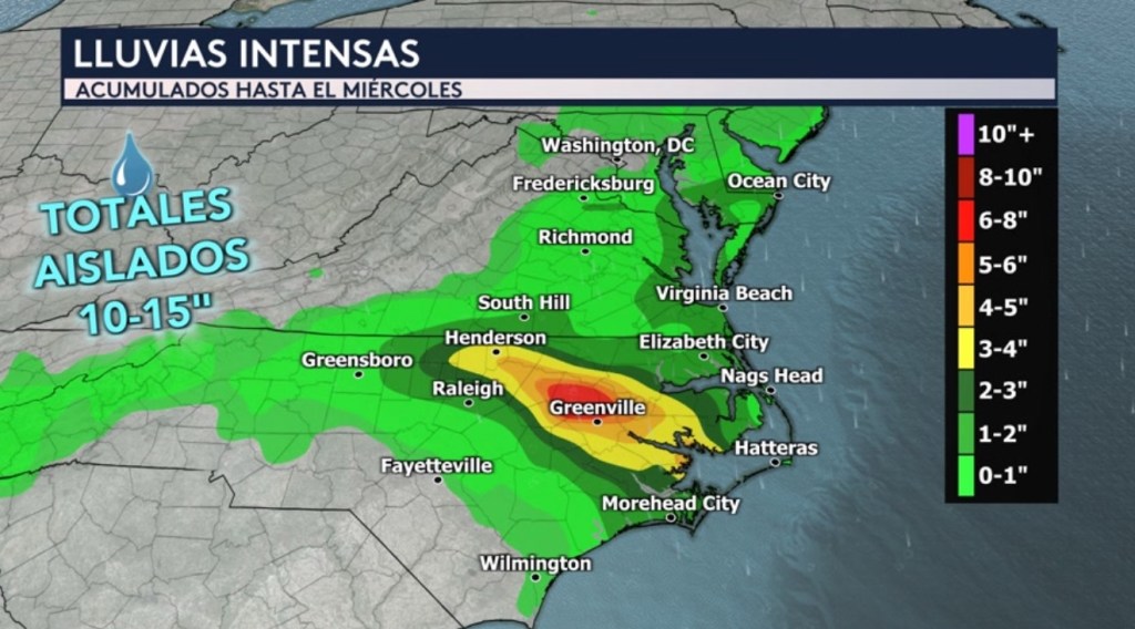 •Además de los vientos, las fuertes lluvias también serán una mayor preocupación con este sistema costero. Nuestro modelo está mostrando entre 5 a 8 pulgadas de lluvia en Carolina del Norte al este del Área de Triángulo desde hoy hasta el miércoles por la noche. Nuestro pronóstico del conjunto de modelos de alta resolución nos indica que los acumulados pudieran alcanzar las 15 pulgadas en zonas aisladas. Las inundaciones pudieran ser localmente significativas si esto ocurre.
