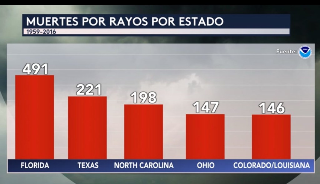 •En un estudio que se llevó a cabo de 1959 a 2016, la NOAA encontró que el estado que ha experimentado la mayor cantidad de muertes debido a los rayos es Florida con 491 dentro de este periodo de 57 años. El estado con la segunda mayor cantidad de muertes fue Texas seguido de Carolina del Norte en el tercer lugar, Ohio en el cuarto lugar y tanto Colorado como Louisiana en el quinto lugar. Es muy importante que cuando escuches un trueno que te refugies inmediatamente.
