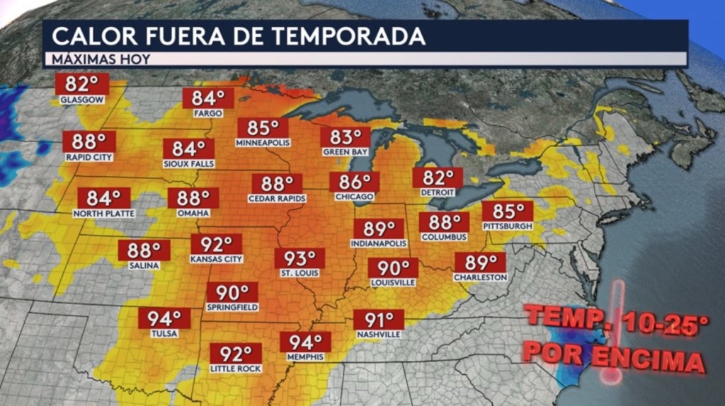 •Las planicies, el Medio Oeste, los Grandes Lagos y los Valles de Mississippi, Ohio y Tennessee estarán experimentando un calor fuera de temporada hoy lunes. Las máximas esta tarde serán de entre 10 a 25°F por encima del promedio para esta época del año e incluye ciudades como Nashville, Memphis, Little Rock, St. Louis, Kansas City, Pittsburgh, Louisville, Indianapolis, Detroit, Chicago, Omaha, Sioux Falls, Fargo y Minneapolis.