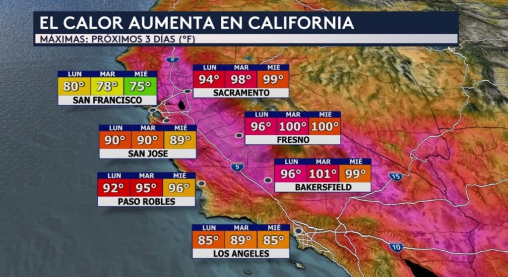 •El calor no solo estará afectando a estos sectores del país sino también a California. Las temperaturas máximas estarán en ascenso entre hoy y el miércoles en los valles centrales del estado con mañana probablemente siendo el día más caliente para muchas de las ciudades mostradas. Sacramento, Fresno y Bakersfield se estarán acercando o alcanzando los tres dígitos el martes y/o el miércoles. Los Angeles, Paso Robles y San José estarán en el bajo y medio rangos de los 90°F. Hasta San Francisco experimentará estas temperaturas cálidas, ya que la máxima de hoy de 80°F representa una anomalía de 10°F por encima del promedio.