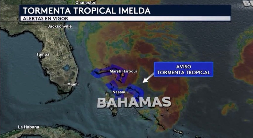 •Imelda, según la última actualización del Centro Nacional de Huracanes se mantiene como una tormenta tropical con vientos máximos sostenidos de 50 mph. Se encuentra a unas 10 millas al sureste de la Isla Great Ábaco en el noroeste de las Bahamas mientras que se desplaza al norte a unas 9 mph.