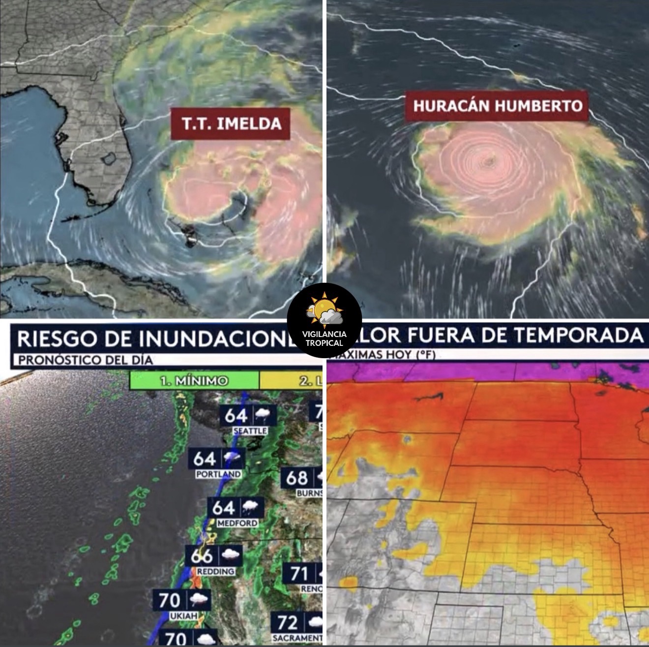 •Estamos vigilando a dos sistemas activos en la Cueca del Atlántico: la Tormenta Tropical Imelda y el Huracán Humberto de categoría 4. Las marejadas asociadas con los dos están provocando condiciones de mar y de playa peligrosas para gran parte de la costa este del país desde Florida hasta Nueva Jersey. Actualmente hay aletas por galerna, alto oleaje, inundaciones costeras y corrientes de resaca en vigor.