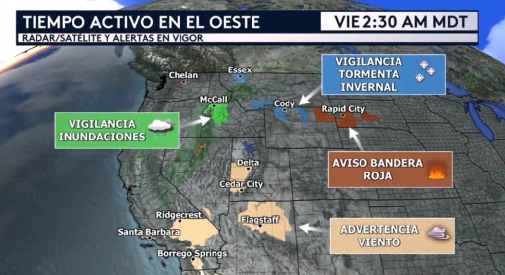 •Habrán fuertes vientos en el suroeste del país hoy, donde vimos a esas advertencias por viento en vigor, abarcando los desiertos y el oeste de la región de las Cuatro Esquinas. Las ráfagas más altas de esta tarde estarán oscilando entre las 30 y 40 mph. Estas condiciones ventosas pudieran provocar polvo que sopla, entonces tengan mucha precaución y estén atentos a las actualizaciones del tiempo especialmente si vives en un lugar como Las Vegas.