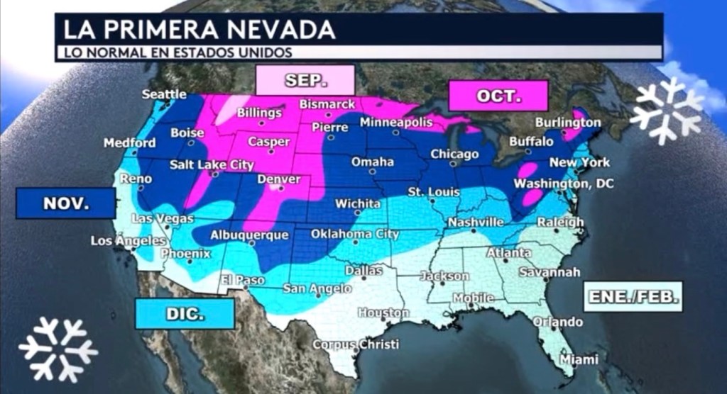 •¿Cuando debemos ver nuestra primera nevada? Es normal, según la climatología, en ver las primeras nevadas de la temporada en las Montañas Rocosas (como vamos a ver este fin de semana), el oeste intermontano, el norte de las Gran Planicies, el Medio Oeste Superior, el centro de las Montañas Apalaches y el interior montañoso de Nueva Inglaterra ahora en octubre. Luego a medida que siga avanzando el otoño y lleguemos al invierno empezamos a ver como esas probabilidades de experimentar las primeras nevadas se desplazan cada vez más al sur.