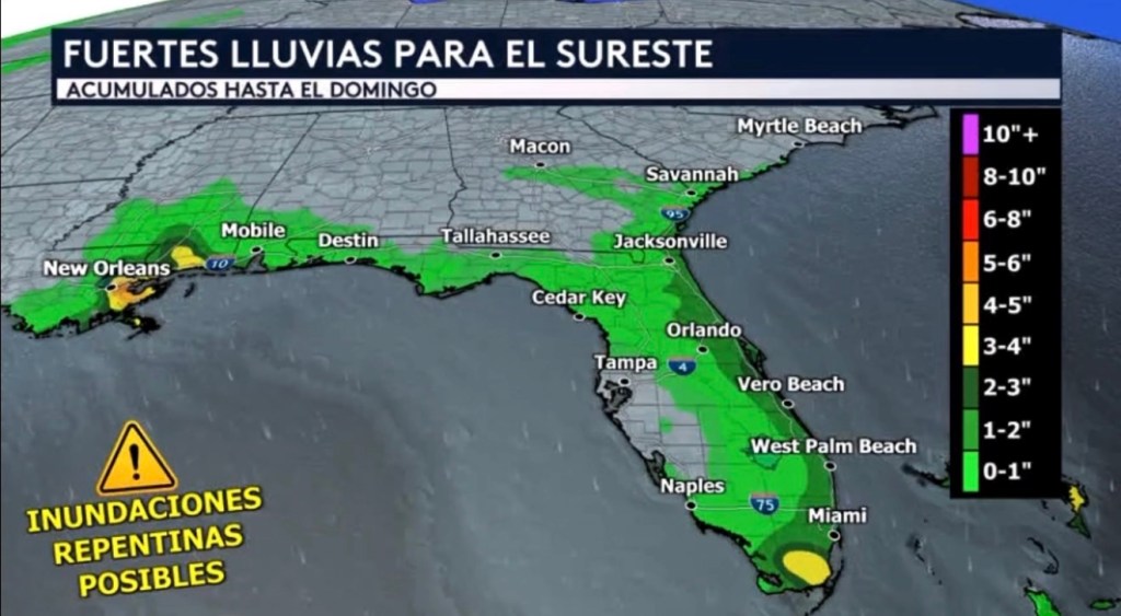 •Nuestro modelo de pronóstico está mostrando de qué los acumulados de lluvia más altos entre hoy y el domingo por la noche pudieran ocurrir al extremo sureste de la península de Florida y al sureste de Louisiana y costa del golfo de Mississippi. Aquí, pudieran caer más de 5 pulgadas en zonas aisladas. Pero noten como también tendremos acumulados de lluvia generalizados de entre 1 a 2 pulgadas con totales aislados superando las 2 pulgadas a lo largo de la costa este entera de Florida debido a un flujo de viento del este-noreste ayudando a transportar mucha de esta precipitación desde el mar hacia nuestras comunidades costeras. Es posible que se generen algunas inundaciones repentinas durante el fin de semana, especialmente donde nuestro pronóstico está mostrando las mayores acumulaciones de lluvia como en Florida, Mississippi y Louisiana.