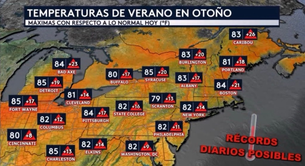 •Hoy tendremos temperaturas muy fuera de estación en el noreste del país donde algunas ciudades tendrán la oportunidad de batir un récord diario de temperatura máxima. ¡Las máximas en algunos lugares serán de hasta 30°F por encima del promedio para esta época del año! La ciudad de Caribou en Maine no solo pudiera batir un récord diario, ¡sino un récord de mes ya que la máxima pronosticada esta tarde de 83°F estará sobrepasando el récord de octubre anterior de 82°F!