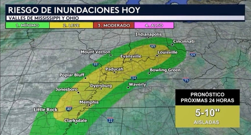 •Como antes mencionado, este frente frío descendiendo al sur y funcionándose con una columna de humedad tropical que se dirige al norte estará trayendo un riesgo de inundaciones repentinas hoy. Hay un riesgo elevado de nivel 2 de 4 en la escala de evaluación para los valles de Mississippi y Ohio que incluye ciudades como Louisville, Evansville, Paducah, Memphis y Jonesboro.