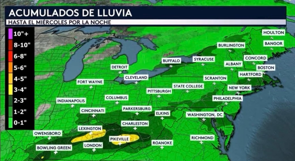 •Pronosticamos acumulados de lluvia generalizados de 2 a 3 pulgadas con totales aislados más altos de más de 4 pulgadas a través Kentucky y Virginia Occidental entre hoy y el miércoles por la noche con el paso de sistema frontal. Hacia el noreste del país, los acumulados no serán tan graves donde algunas zonas estarán recibiendo hasta 2 pulgadas.