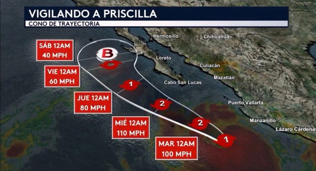 •Pronosticamos que Priscilla se siga moviendo lentamente al nor-noroeste durante la jornada de hoy paralelo a la costa de México, antes de hacer un giro al noroeste o al oeste-noroeste mañana martes. Esto lo alejará de la costa de México continental y lo apuntará en la dirección de Baja California Sur. Priscilla seguirá tomando esta trayectoria al noroeste o al oeste-noroeste durante los próximos días, probablemente llevándolo al oeste de la península de Baja California Sur.