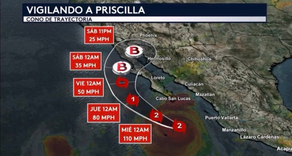 •Priscilla, según el último boletín del Centro Nacional de Huracanes de las 8:00AM EDT, ahora es huracán de categoría 2 con vientos máximos sostenidos de 100 mph. Ha comenzado su movimiento al noroeste, donde lo está haciendo actualmente a unas 10 mph.