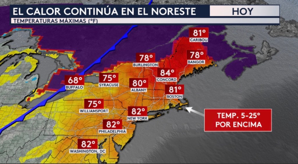 •El calor continuará en el noreste del país hoy con temperaturas máximas que serán entre 5 a 25°F por encima del promedio para esta época del año, incluyendo a ciudades como Boston, Nueva York, Philadelphia y Washington DC. ¡Las anomalías mas altas, igual que ayer, se encontrarán en los estados de Vermont, Nuevo Hampshire y Maine donde la ciudad de Caribou pudiera ver 3 días consecutivos en el mes de octubre con una máxima de 80°F o mayor! Recuerda que ellos ayer establecieron el récord de la mayor cantidad de días en el mes de octubre con una máxima superando los 80°F (2 días).