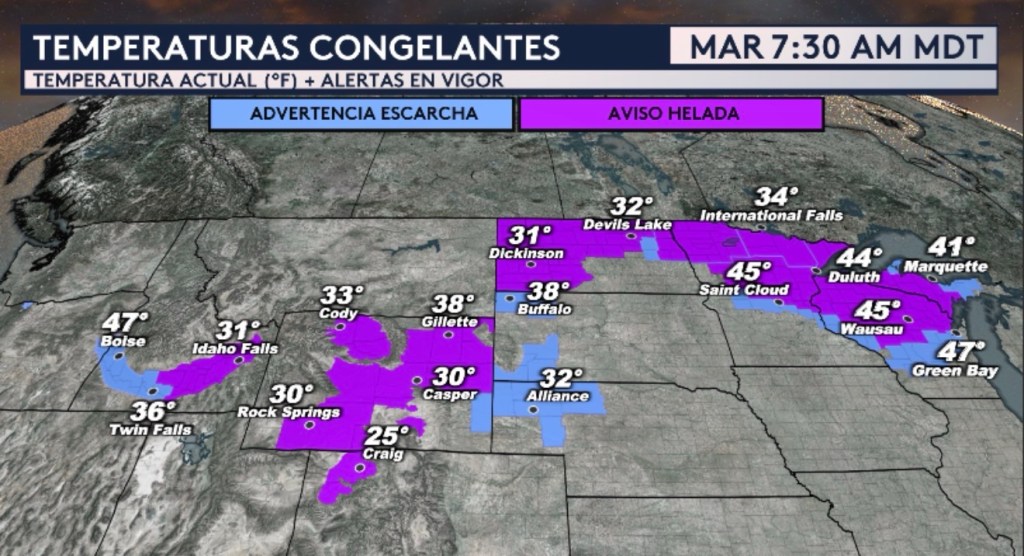 •Las temperaturas frías detrás de este mismo frente frío ya se están sintiendo a través del oeste intermontano, el norte de las Montañas Rocosas, el norte de las Gran Planicies y el Medio Oeste Superior donde hay advertencias por escarcha y avisos por helada en vigor a esta hora de la mañana.