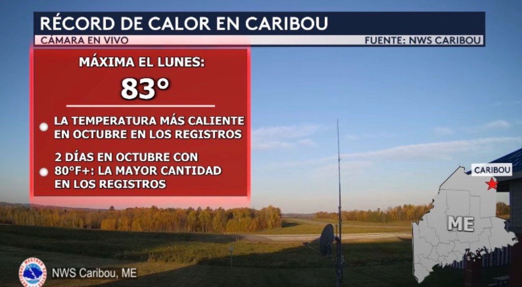 •Vemos una cámara en vivo desde Caribou en Maine, ¡donde ayer registraron la temperatura más caliente en el mes de octubre en los registros! La máxima de 83°F sobrepasó el récord de mes anterior de 82°F. Con esta máxima de ayer, ahora llevamos 2 días este octubre con una máxima de 80°F, ¡la mayor cantidad de los registros!