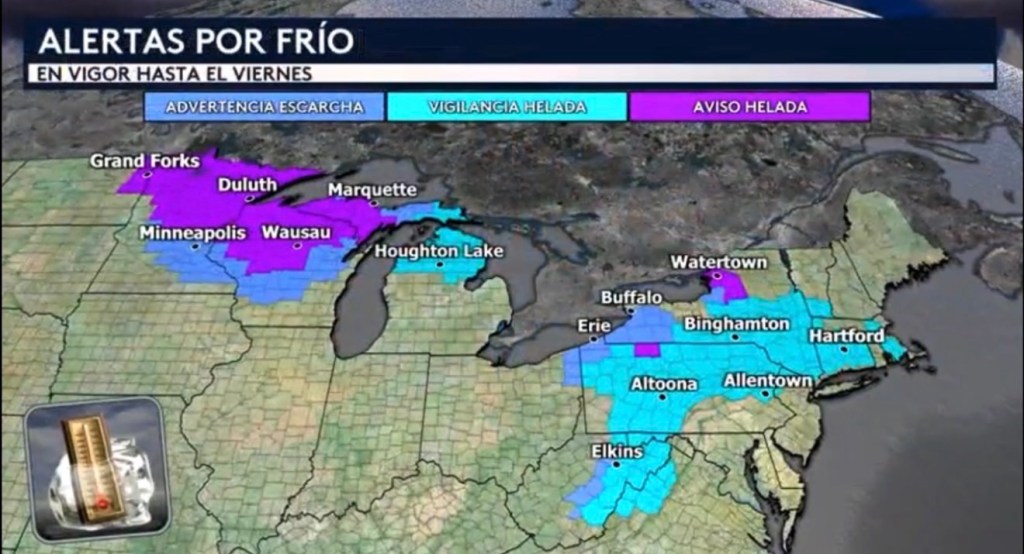 •En anticipación de estas temperaturas frías y por las que ya están presentes, hay advertencias por escarcha y vigilancias o avisos por helada en vigor desde el Medio Oeste a través del norte de los Grandes Lagos y hasta el noreste del país. Estas alertas estarán en vigor hasta el viernes por la mañana.