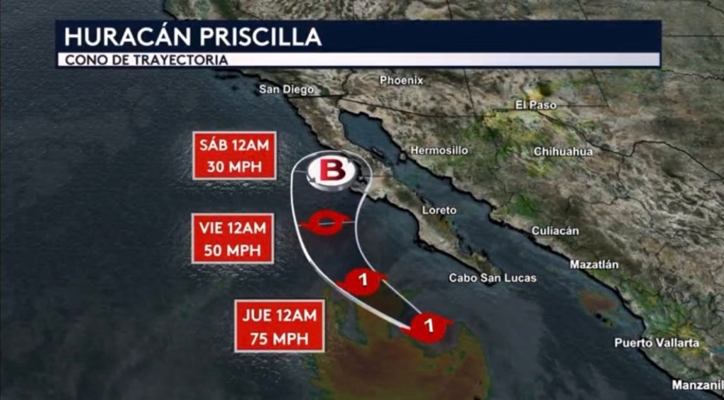 •Seguimos monitoreando al Huracán Priscilla, que se ha debilitado significativamente ya que ya se ha estado moviendo sobre aguas más frías. Esto se refleja en las imágenes de satélite, donde estamos viendo a esta ahora de la mañana que el huracán ha perdido mucha de su actividad convectiva alrededor de su núcleo. Actualmente tiene vientos máximos sostenidos de 80 mph y se ubica a unas 195 millas al suroeste del extremo sur de Baja California Sur. Se está moviendo al noroeste a unas 8 mph.